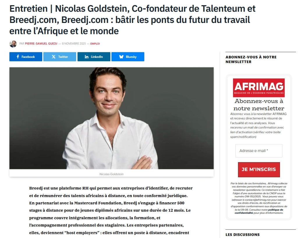 L’article d’Africa Mag ( https://afrimag.net/entretien-nicolas-goldstein-co-fondateur-de-talenteum-et-breedj-com-breedj-com-batir-les-ponts-du-futur-du-travail-entre-lafrique-et-le-monde ) met en lumière ce que de nombreux acteurs économiques constatent désormais : Talenteum n’est pas simplement une solution RH, mais une passerelle stratégique entre les besoins mondiaux en compétences et le potentiel immense du continent africain.