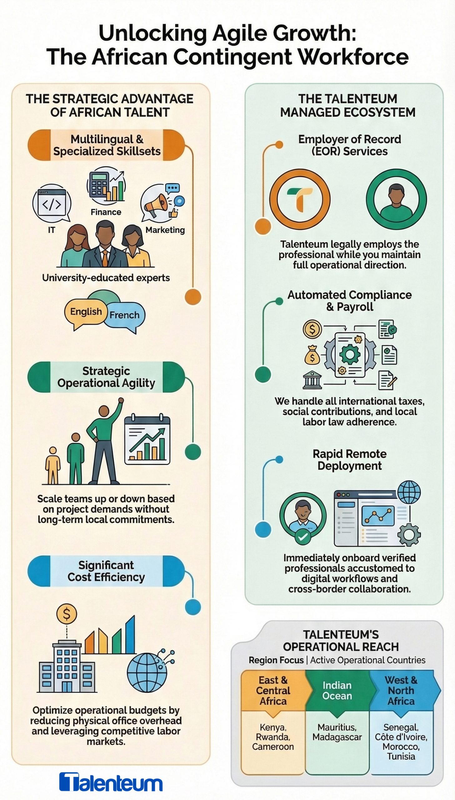With a presence in nine key countries Mauritius, Madagascar, Kenya, Rwanda, Morocco, Tunisia, Côte d’Ivoire, Senegal, and Cameroon Talenteum offers compliant and ethical solutions that ensure workforce management is smooth, secure, and fully aligned with local labor regulations. This article explores the benefits of leveraging a contingent workforce in Africa and how Talenteum supports organizations every step of the way.